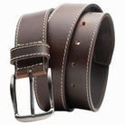 An accent belt dreamed up for all generations! Casual style with a priority on comfort. Complementary cream double stitching runs the length of this full grain brown leather belt strap. With a stitched-on polished buckle, this sleek belt is nickel-free and style forward.