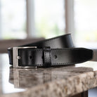 This belt strap is made of solid full grain leather for added durability and comfort. The nickel free buckle is stitched to the strap, which means there is no other metal touching your skin. The sheen of the black strap can push it up a level to a dress belt, but it also wears perfectly in the casual setting.